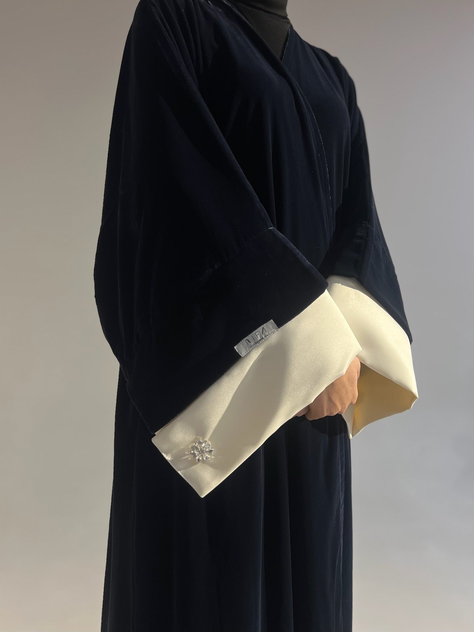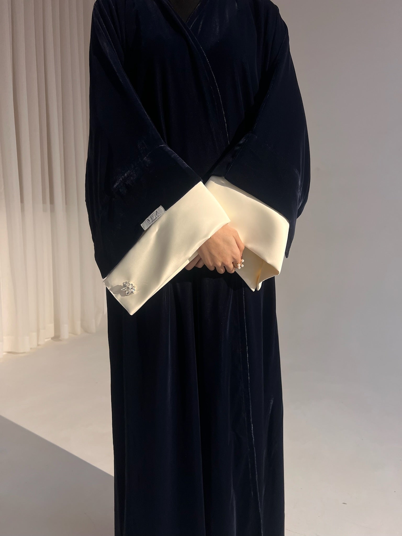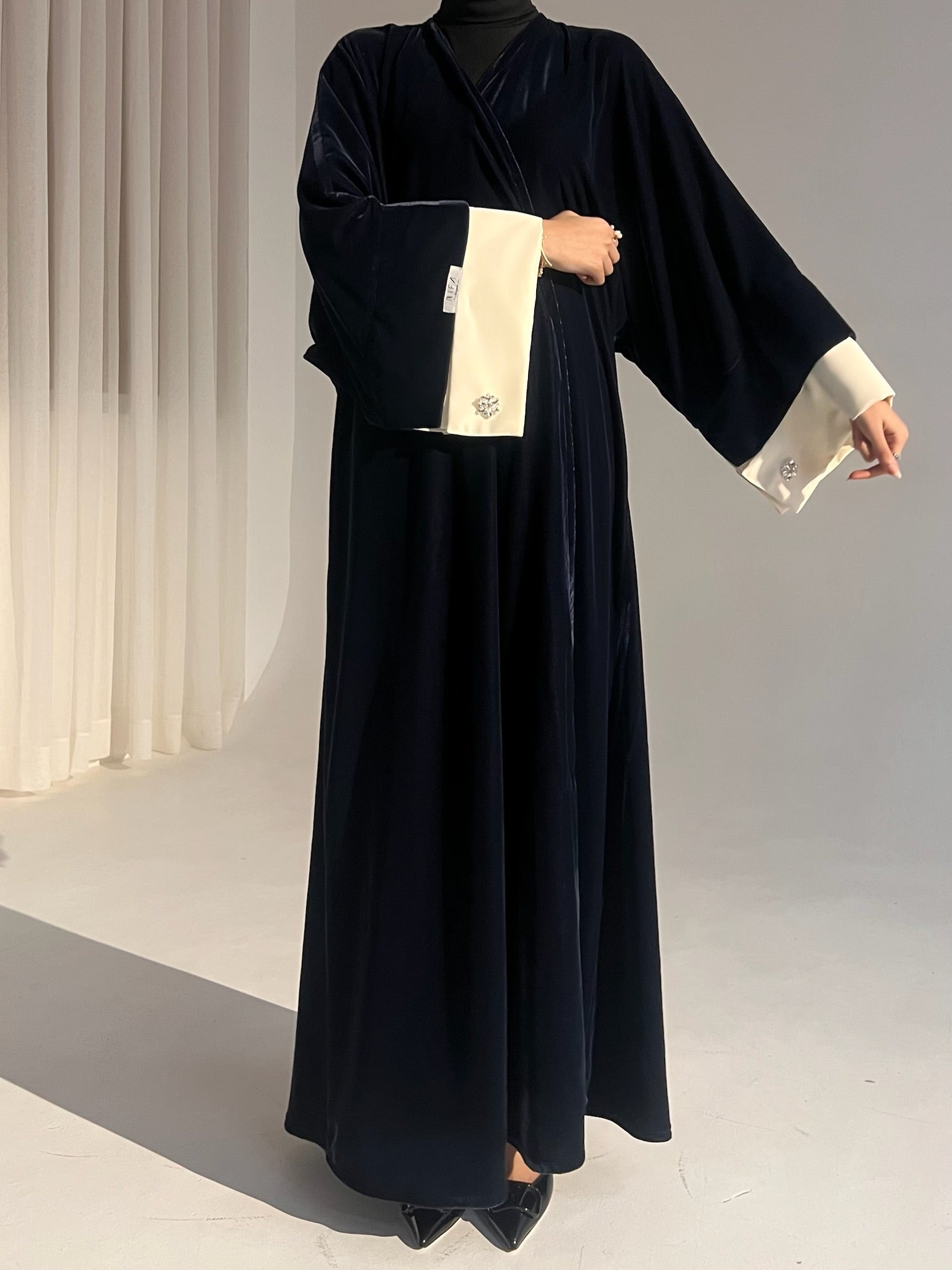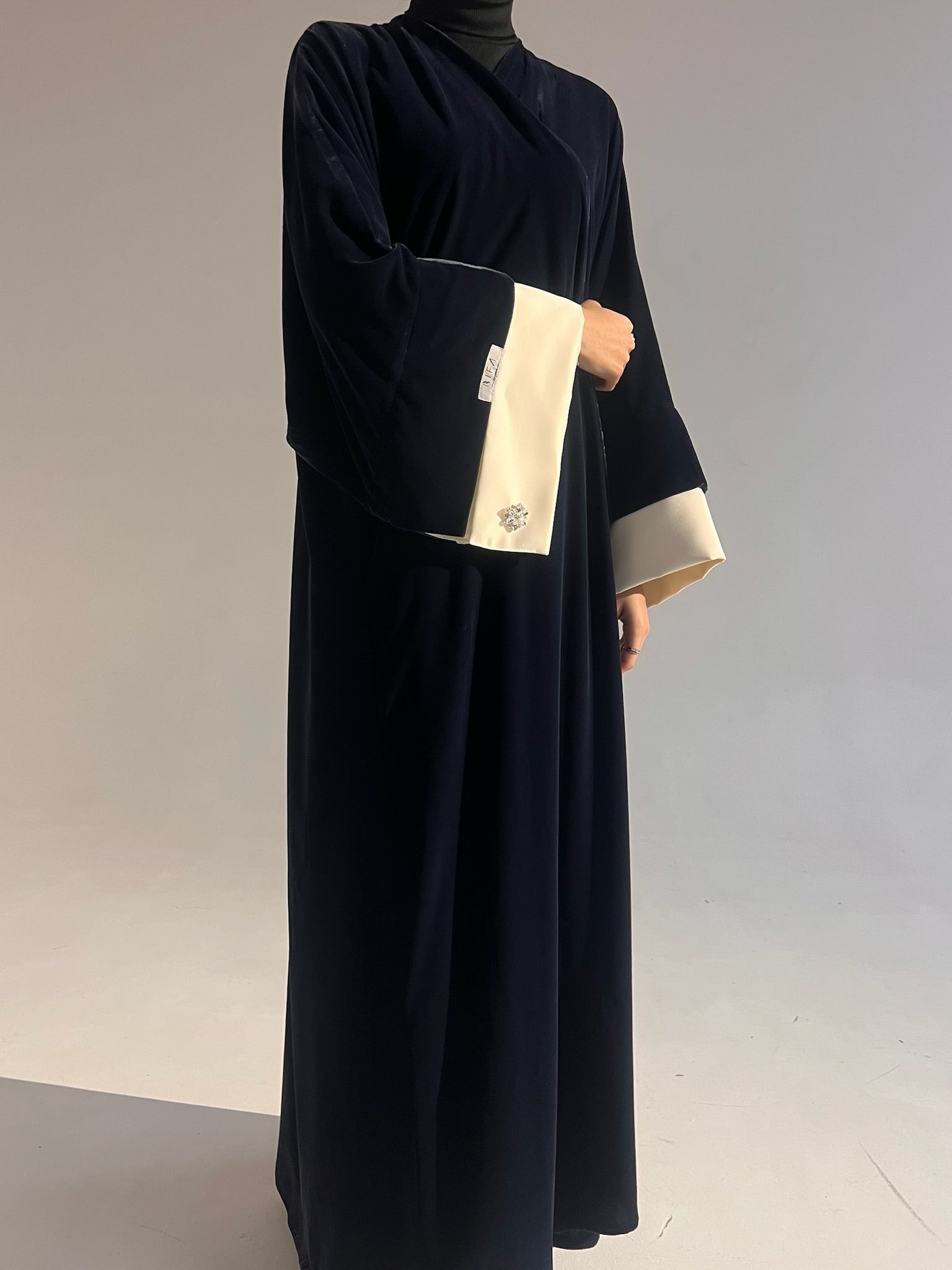 ارتقي بإطلالتك مع هذه العباية الفاخرة المصممة بقصّة بشت كلوش تمنحك وسعًا وانسيابية راقية. صُنعت من مخمل كحلي ناعم يضفي عمقًا ولمعة أنيقة، وتكتمل فخامتها بتفاصيل الأكمام العريضة بلون الأوف وايت، المزيّنة بلمسة من ازرار الكرستال ناعمة تزيد من تميز التصميم.