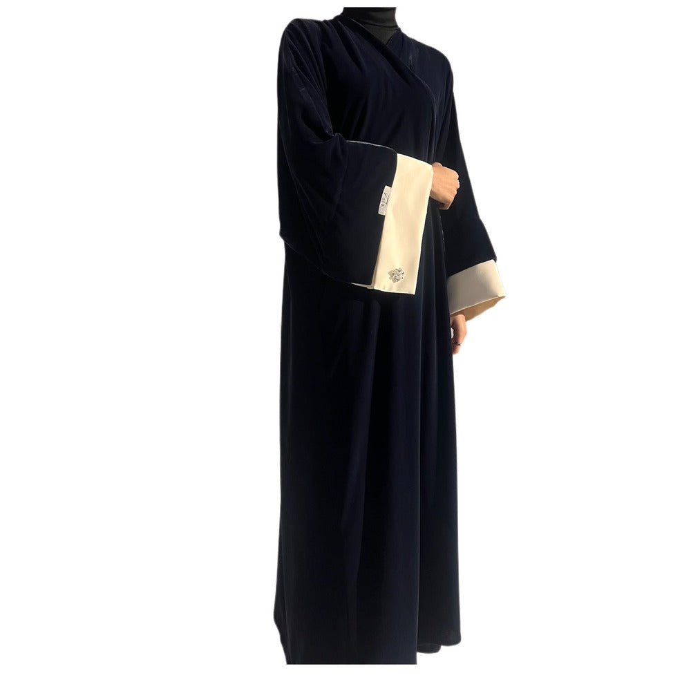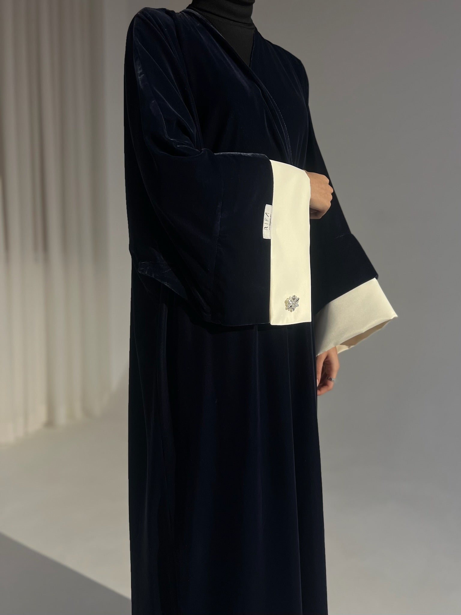 عباية بشت ذو أكمام واسعة مخمل – أناقة كحليّة بتفاصيل أوف وايت فاخرة