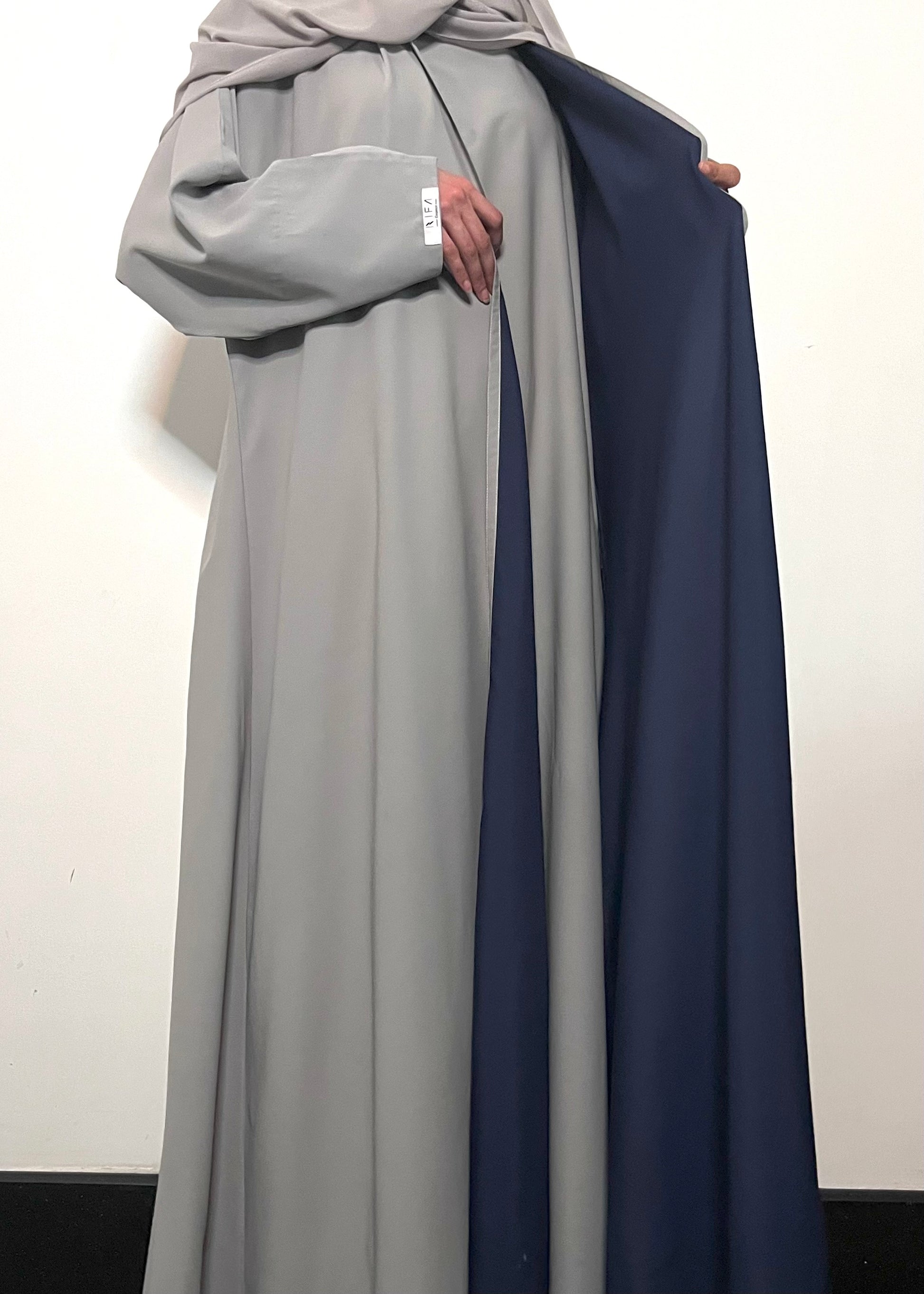 عباية يومية بتصميم كلوش أنيق وبسيط، تجمع بين اللون الرمادي الفاتح والكحلي. مصنوعة من قماش الكريب الناعم، مما يوفر لك راحة وملمساً باردًا.